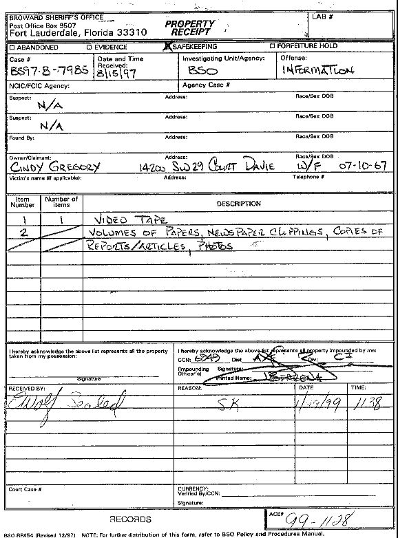 Plaintiff Cindy Carol Gregory swore under oath in deposition (page 123, lines 9 through 16) that she had no contact with Detective John Berrena, except by telephone, so how can Detective John Berrena justify his signature on this evidence?  You can't send a videotape, newspaper clippings, et, over a phone line.  (Just so happens that good old detective John Berrena worked in plaintiff Scott K. Bagwell's district 8, and timeshare salesmen can do a lot towards getting you a nice vacation place.)