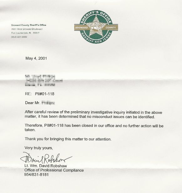 Carr was Homicide Detective John Berrena's boss, the BSO Detective who CONCEALED EVIDENCE.  After the missing evidence was discovered, it was investigated by Sgt Carr, NOT the Internal Affairs Department. ALL NAMES AND DATES RELATING TO INTAKE WERE ERASED.   Carr then photocopied my custody sheet.  I immediately notified the SPECIAL PROSECUTIONS DIVISION of the STATE ATTORNEY'S OFFICE.